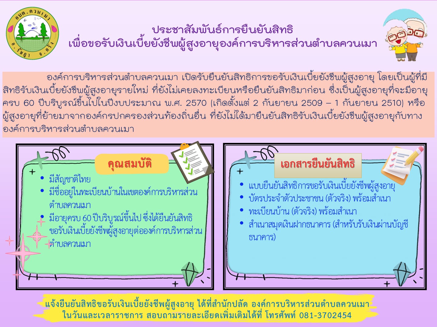 ประชาสัมพันธ์การยืนยันสิทธิขอรับเงินเบี้ยยังชีพผู้สูงอายุ ประจำปีงบประมาณ 2570